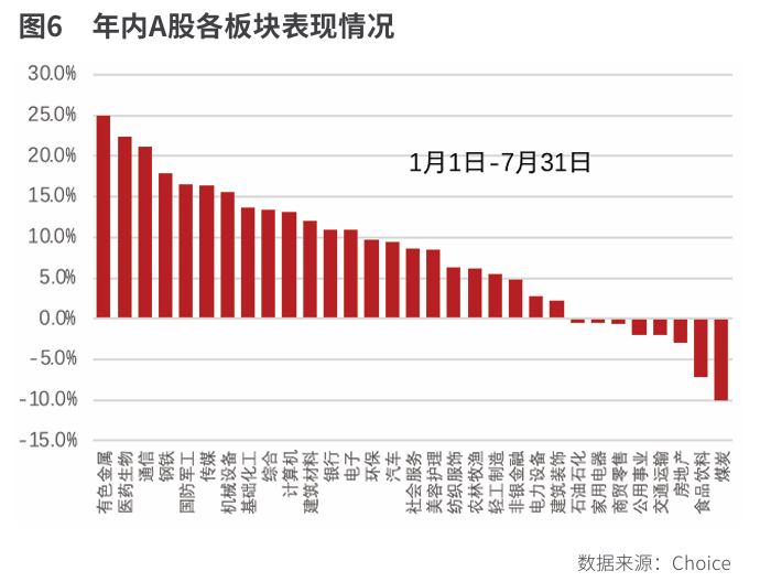 虽然全体市场不竭攀升,但市场的布局化特征仍较为较着。截至7月31日,年内领涨的板块别离是有色金属、医药生物、通信,涨幅均超20%;相对掉队的板块别离是煤炭、食物饮料、房地产,都有必然程度的下跌。这种布局化的特征明显添加了投资的难度,正在市场“下有底”的布景下,若何找到市场进攻的标的目的,是取得超额收益的环节。